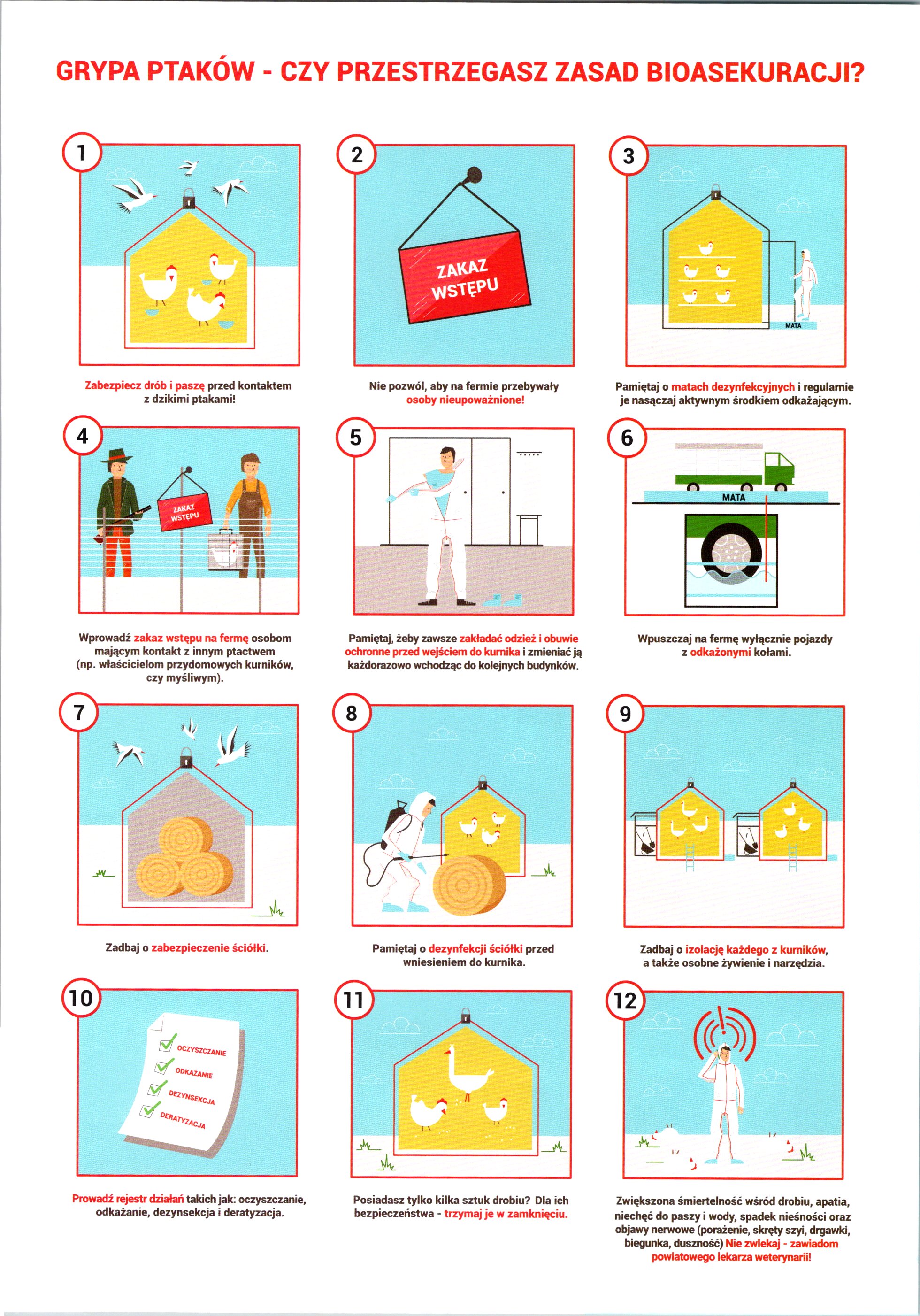 Powiatowy Lekarz Weterynarii w Słupcy w związku z aktualną sytuacją epizootyczną w Polsce odnośnie wysoce zjadliwej grypy ptak6w (HPAI) w załączeniu przesyła ulotkę informacyjną dotyczącą zasad bioasekuracji w gospodarstwach utrzymujących drób.