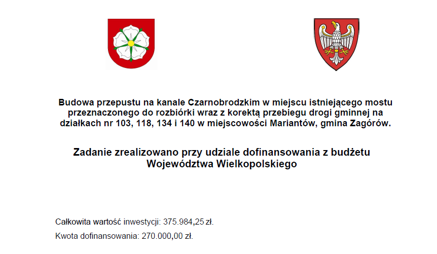 „Budowa przepustu na kanale Czarnobrodzkim w miejscu istniejącego mostu przeznaczonego do rozbiórki wraz z korektą przebiegu drogi gminnej na działkach nr 103, 118, 134 i 140 w miejscowości Mariantów, gmina Zagórów.